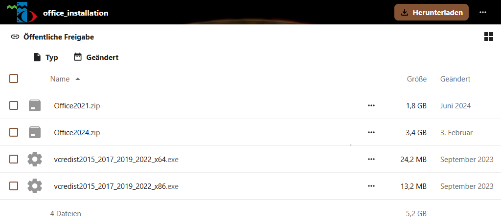 Hier klicken Sie auf die gewünsche Office Version (bspw. Office2021.zip) und die Dateien werden herunterladen. Nach dem herunterladen muss die Datei entpackt werden, die geschieht wie folgt: