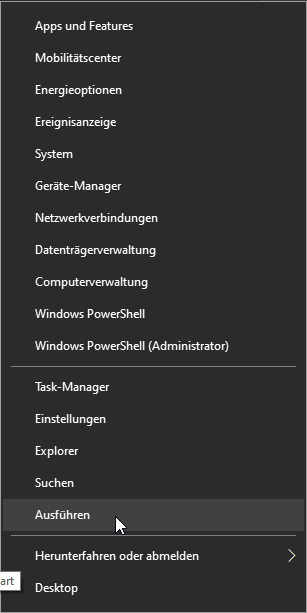 1. Klicken Sie mit der rechten Maustaste auf das Start-Symbol und wählen Sie dort den Punkt "Ausführen":