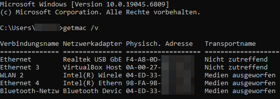 3. In dem Fenster geben Sie den Befehl "getmac /v" ein: